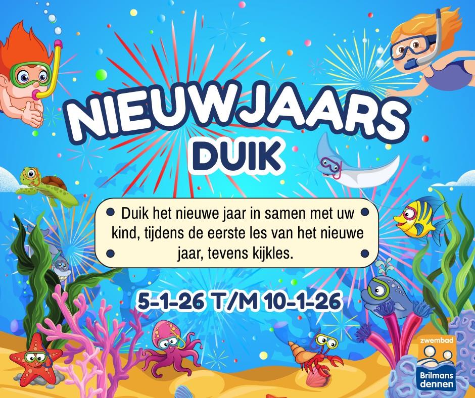 Na het grote succes van vorig jaar nodigen wij u van harte uit om tijdens de eerste zwemles van het nieuwe jaar samen met uw kind een feestelijke nieuwjaarsduik te maken!